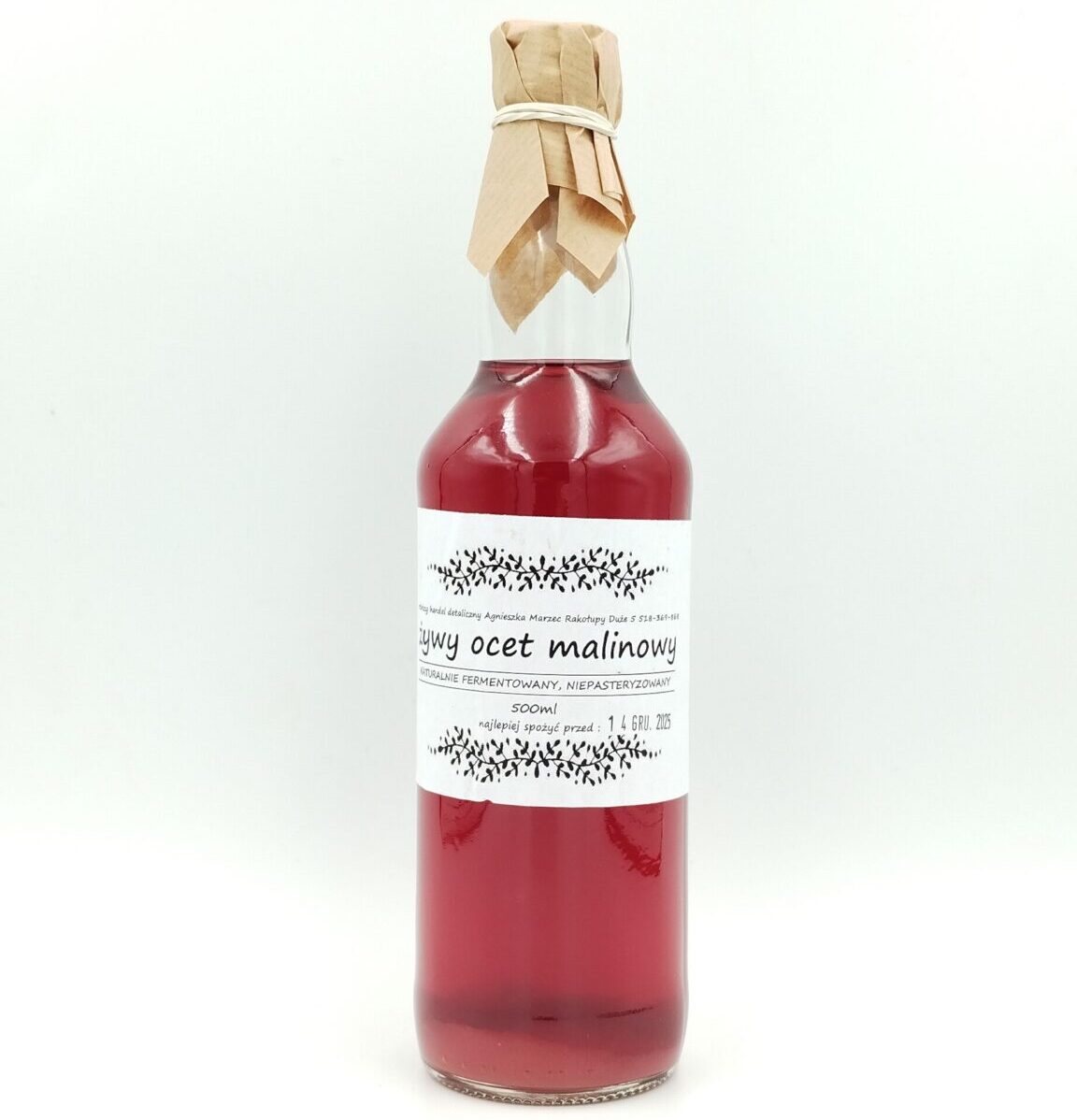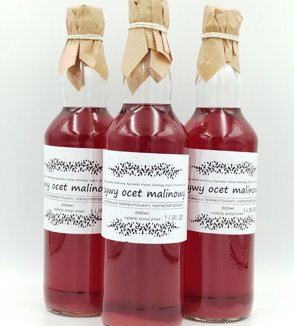 - Produkt: naturalny, niepasteryzowany ocet powstający w procesie fermentacji malin z dodatkiem matki octowej.